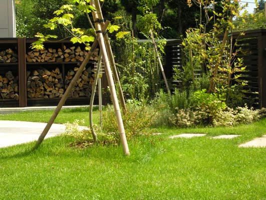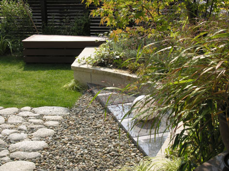 雨水排水の大きな最終桝は少し見苦しいものです。楔形のミニマルなフォルムのウッドデッキで隠しました。