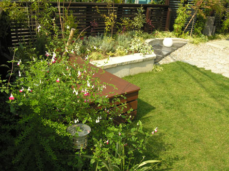 レイズドベッド(高床花壇)とデッキ Raised Bed and Wedge Deck レイズドベッド(高床花壇)はイングランドではカジュアルなスタイルです。草花のみずみずしさを目近で見られる幸せを日々感じとりながらお子様たちが育って行きます。
