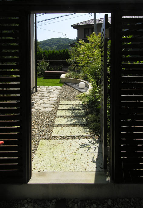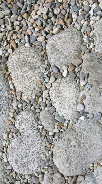 延石 Stone Pavement 山形県朝日山系の花崗岩川石を用いコンテンポラリーな「草の延石」をつくりました。とても貴重な川石です。仙台産の川砂利と調和したマチエールがきれいです。