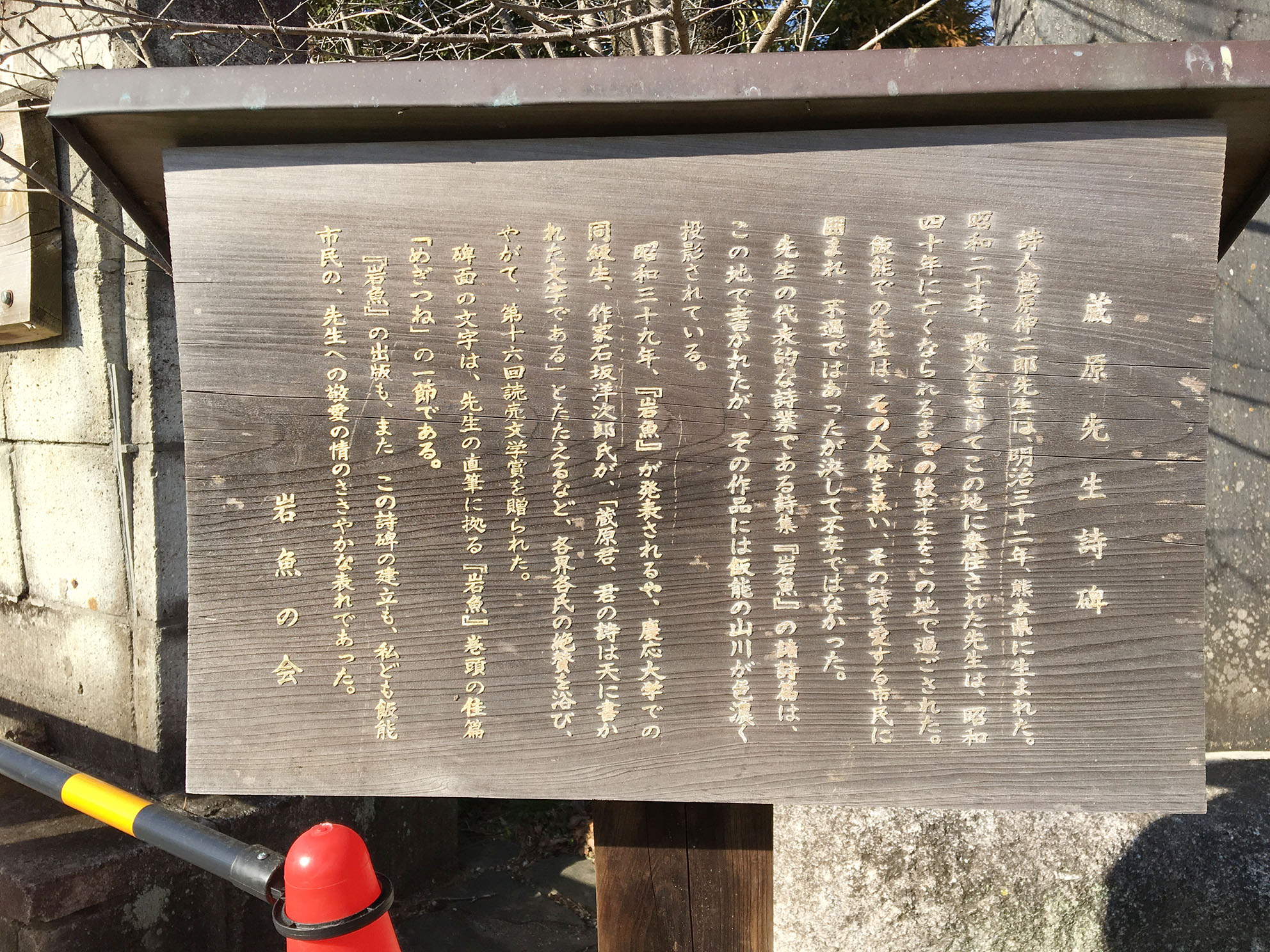 この詩碑は、蔵原が死去した翌年の昭和四十一年に、当時の能仁寺住職萩野昌巳が会長を務めていた飯能市観光協会によって建立された。 (森川晃治著 さいたまの近代文学から抜粋)