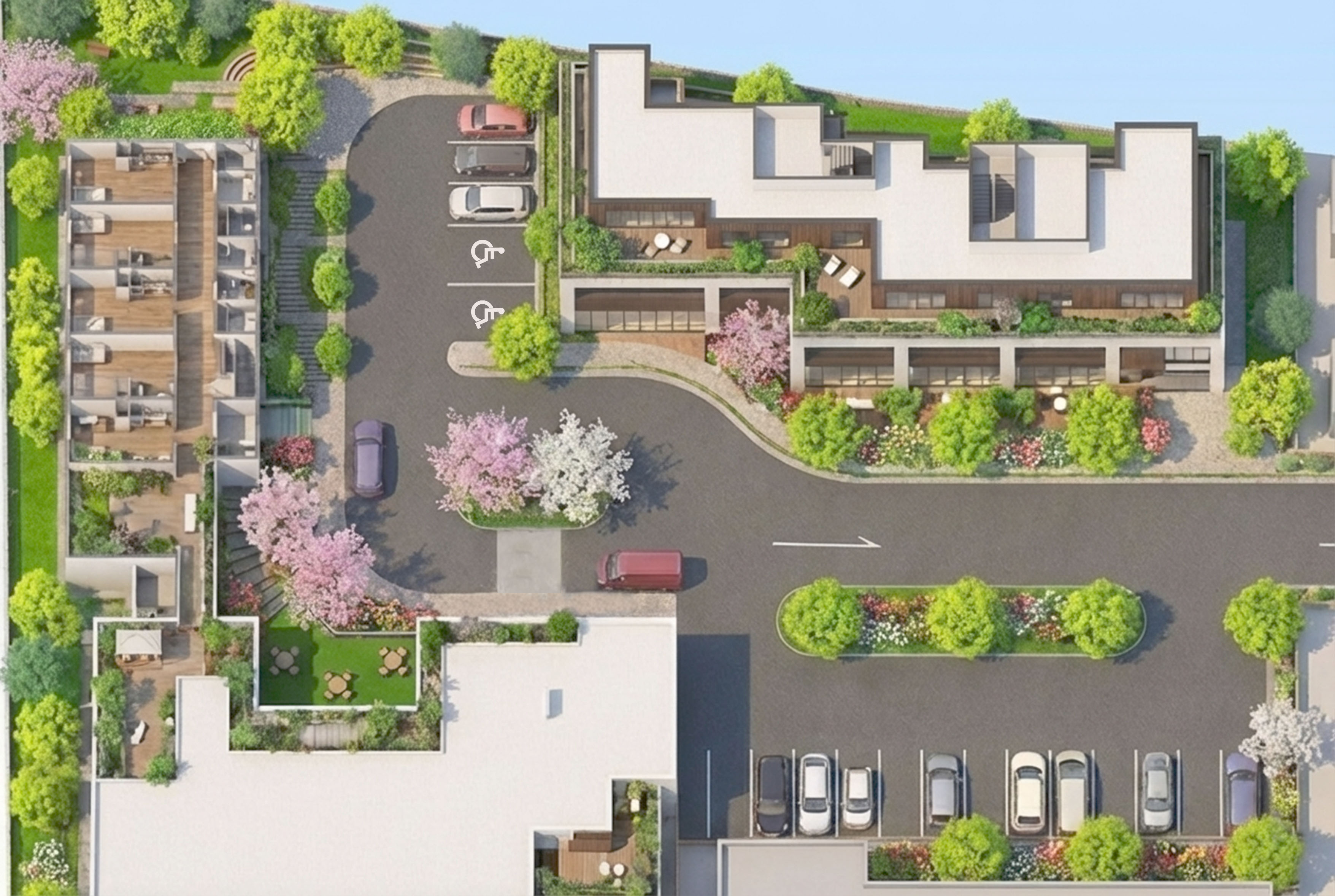 - 送迎・巡回・休憩の動線に緑を配置