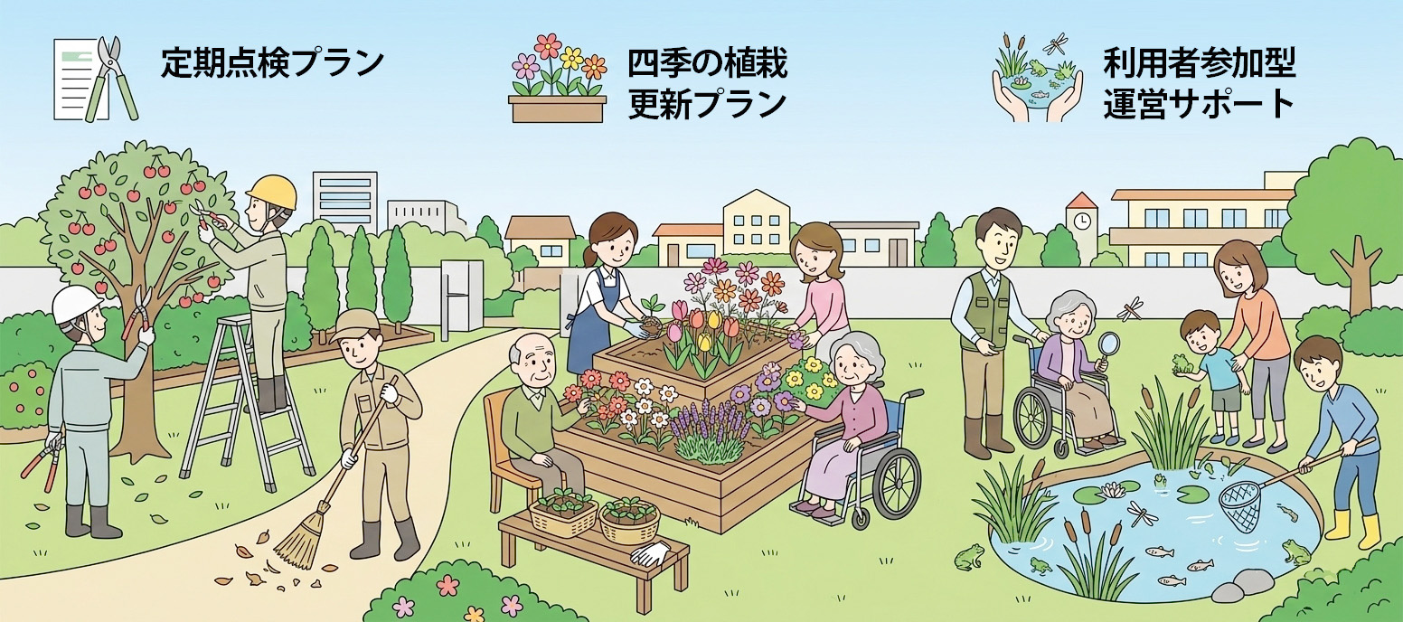 季節ごとの植栽入替や花壇デザイン更新で、利用者の感性刺激と見学者の印象を強化します。