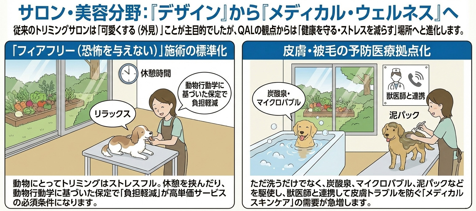 従来のトリミングサロンは「可愛くする(外見)」ことが主目的でしたが、QALの観点からは「健康を守る・ストレスを減らす」場所へと進化します。