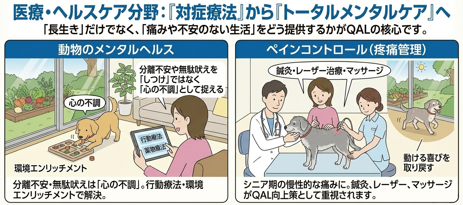 特にシニア期のペットに対し、関節痛などの慢性的な痛みを取り除くための鍼灸、レーザー治療、マッサージが、「動ける喜び」を取り戻すためのQAL向上策として重視されます。