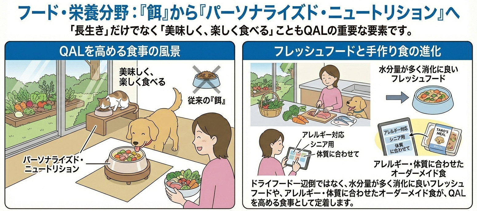 ドライフード一辺倒ではなく、水分量が多く消化に良いフレッシュフードや、アレルギー・体質に合わせたオーダーメイド食が、QALを高める食事として定着します。